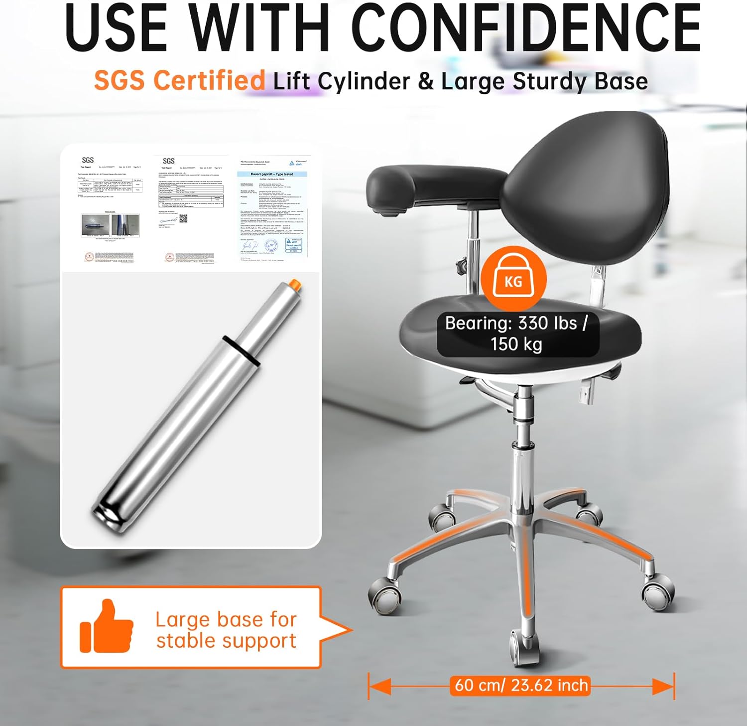 Dental Assistant Chair PU Leather with Swivel Armrests, Rolling Dental Chair, Ergonomic Swivel Dentist's Stool with Backrest for Clinics, Tattoo, Home and Laboratory - Black