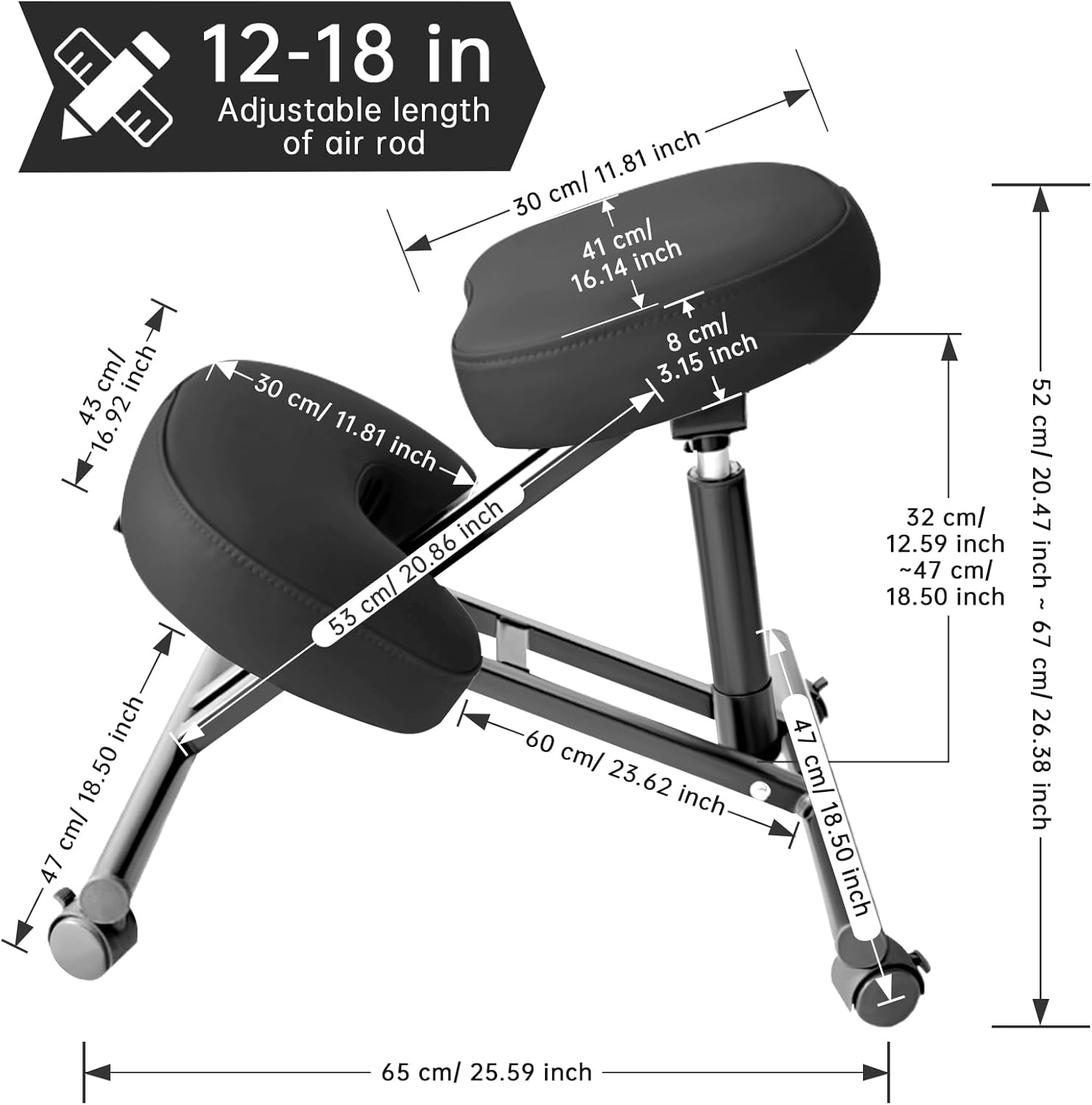 Pull the pneumatic lever to adjust seat height from 20 inches to 26 inches. Kneeling stools are suitable for a variety of users.