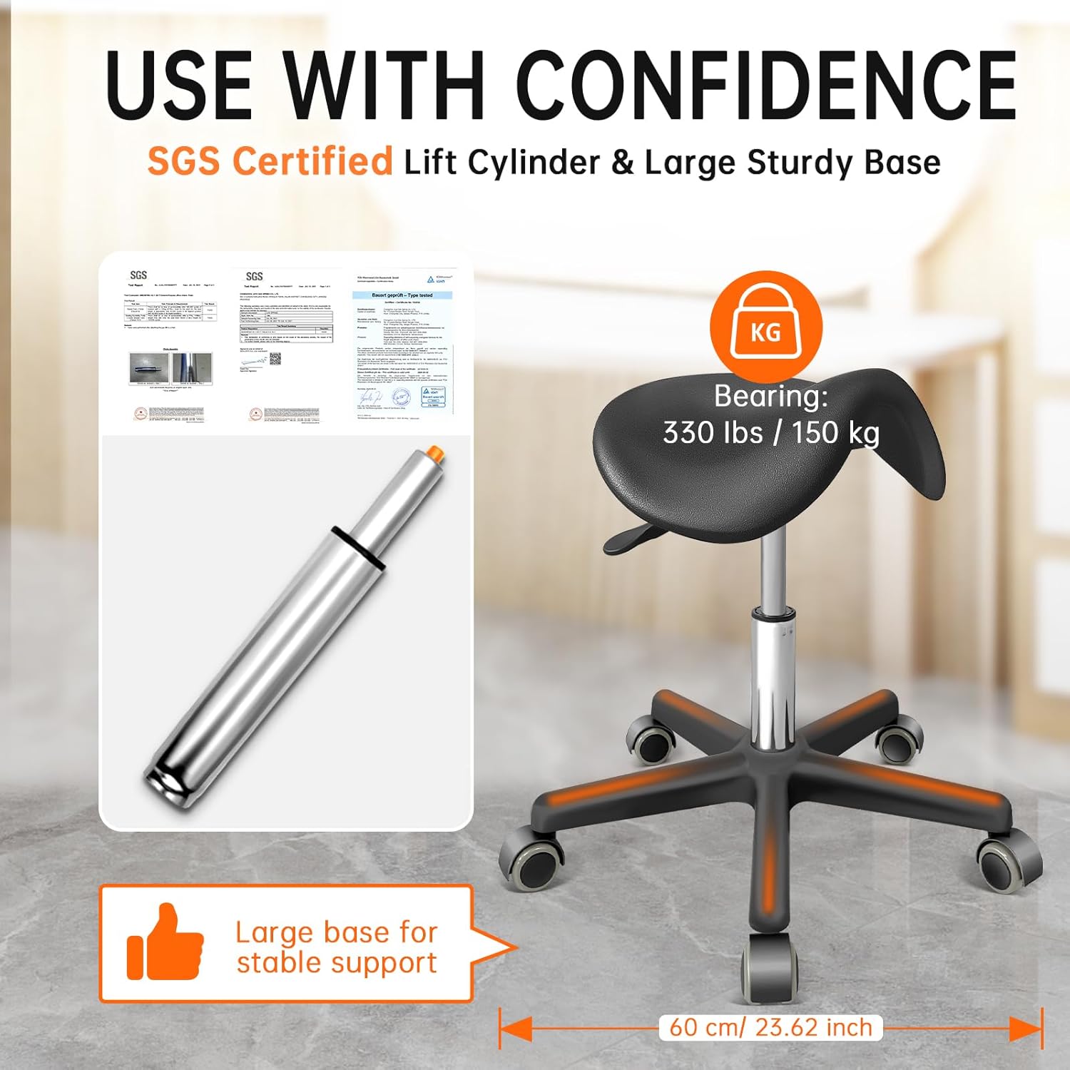 Saddle Stool with Wheels - Anti-Static Ergonomic Adjustable Rolling Stool for Salon, Spa, Office & Home - 360° Swivel Hydraulic Chair with Footrest, 330LB Capacity, Black
